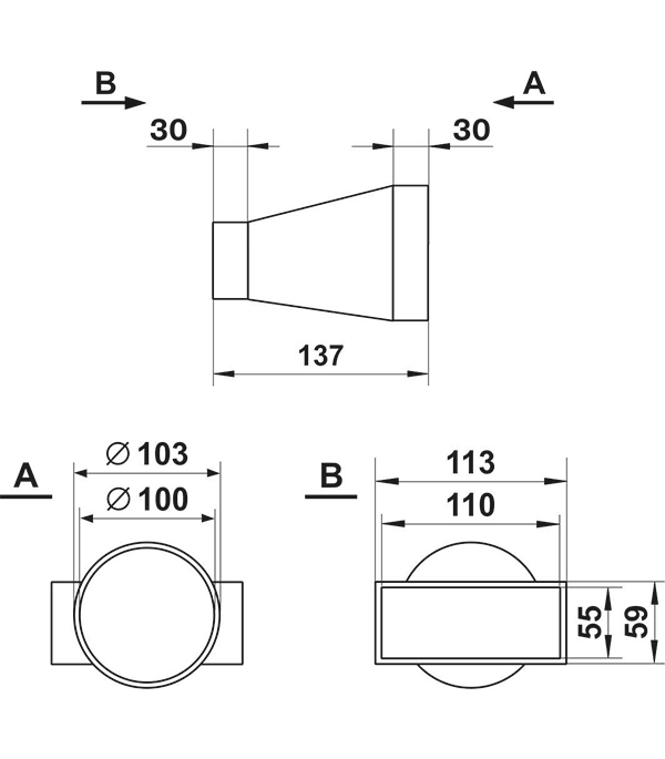 Предназначен для соединения в одной плоскости круглых вентиляционных каналов диаметром 100 мм с плоскими.Применяется при несовпадении осей стыкуемых воздуховодов.