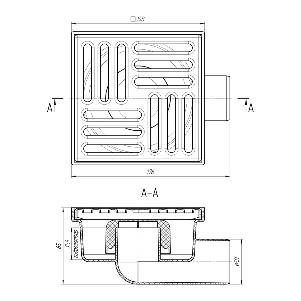 Трап горизонтальный Ани пласт (TA5112) с гидрозатвором 150х150 мм d50 мм решетка из нержавеющей стали