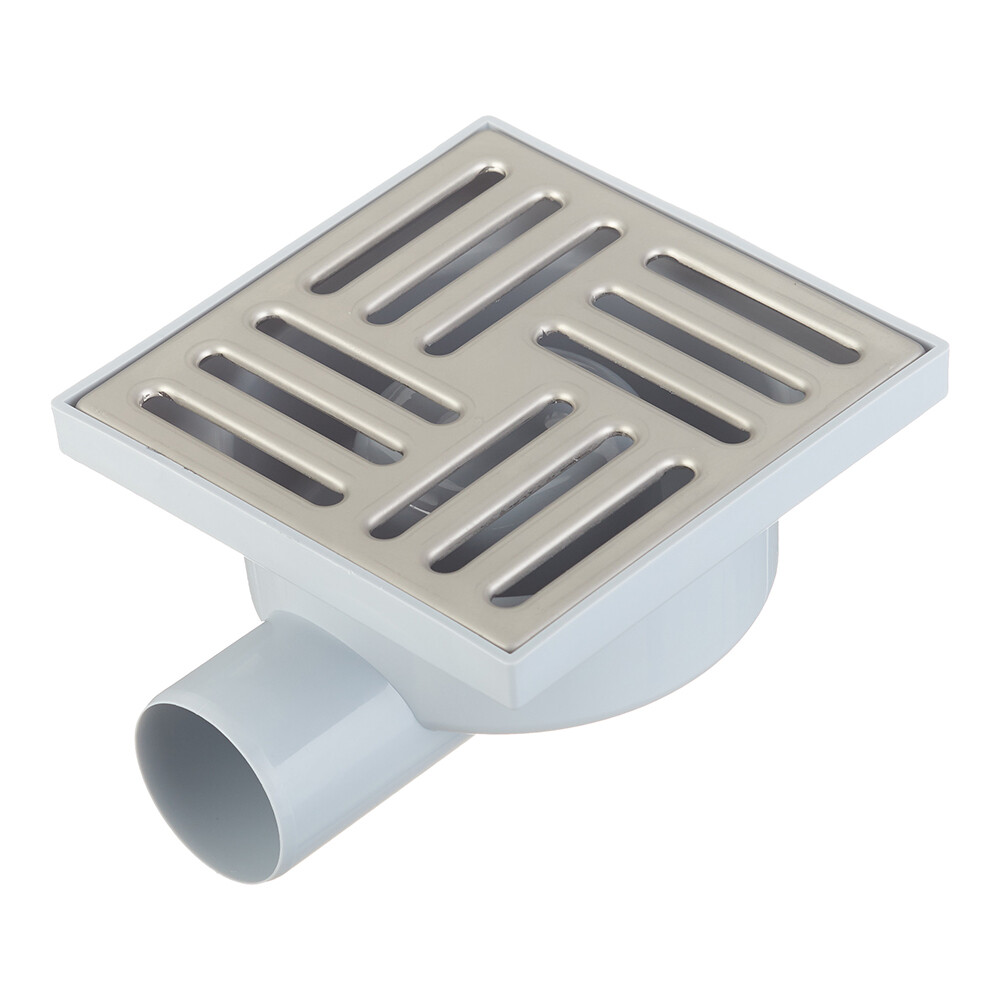 Сливной горизонтальный точечный трап с гидрозатвором и решеткой из нержавеющей стали 150x150 мм.